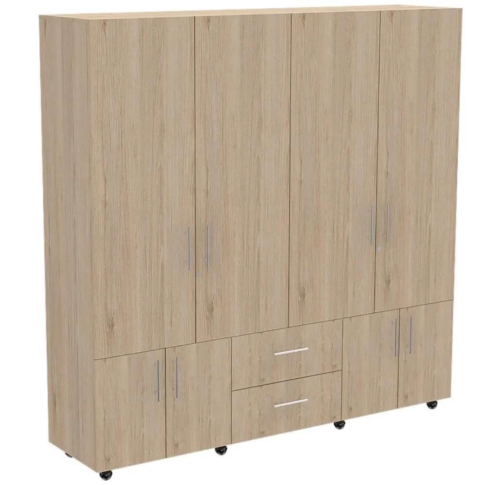 El cantelmo, gracias a su color aporta armonía en tu espacio. Cuenta con ocho puertas abatibles, cuatro de ellas con manija metálica al igual que los dos cajones. En su totalidad, tiene catorce compartimientos donde puedes situar tus objetos personales. Dos de ellos cuentan con un tubo metálico ideal para colgar las prendas de tu preferencia. Los de la parte inferior son perfectos para que los uses como zapatero.