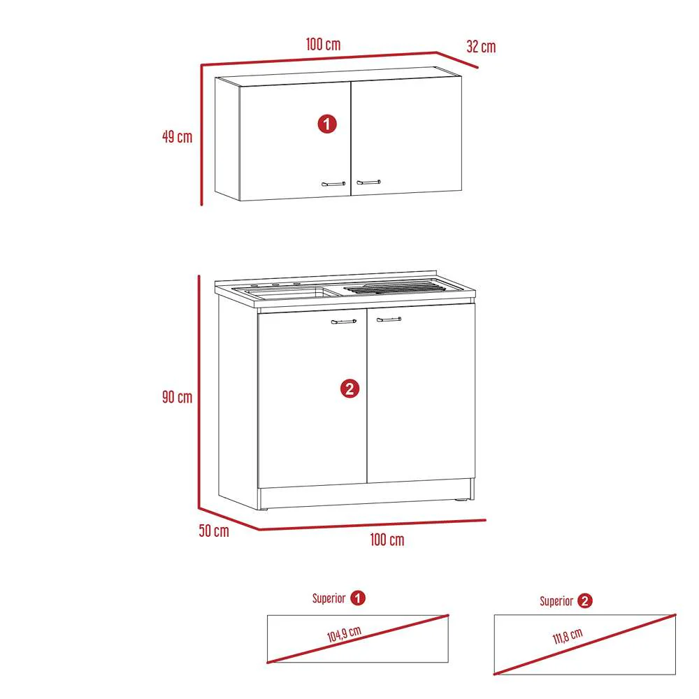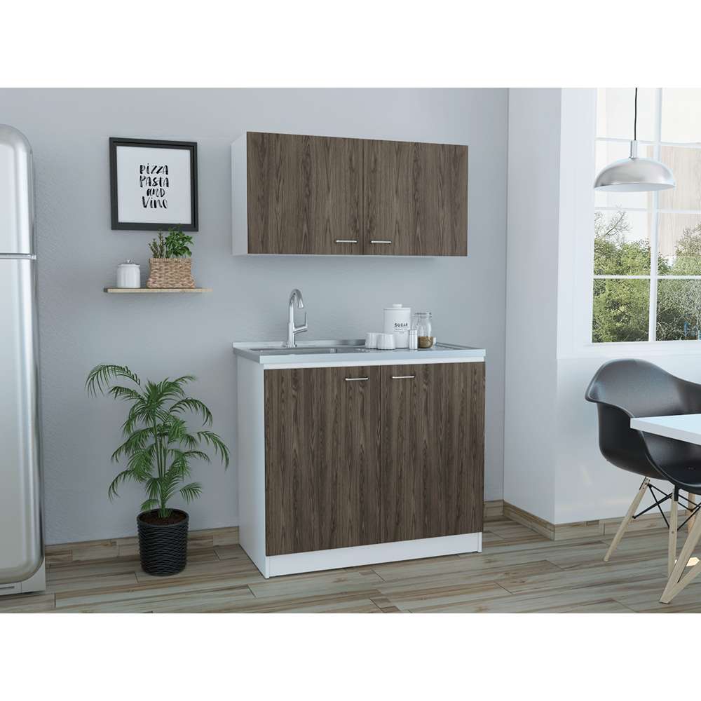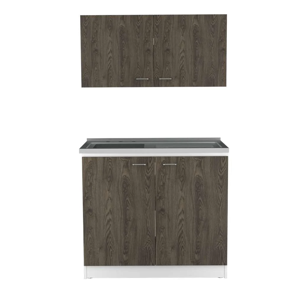 Kit de lavaplatos con mueble superior e inferior, practico meson con acero incluido, cuatro puertas abatibles, buena capacidad de almacenamiento, manijas metalicas, patas en acero cromado, facil instalacion a la pared con chazos