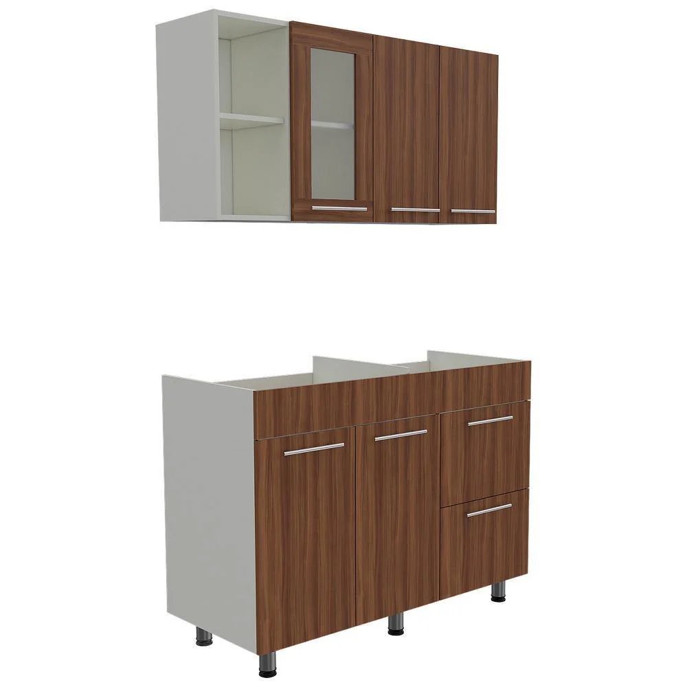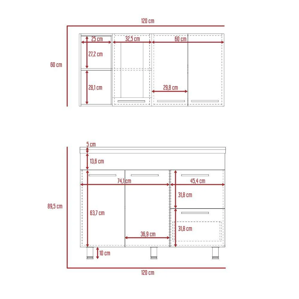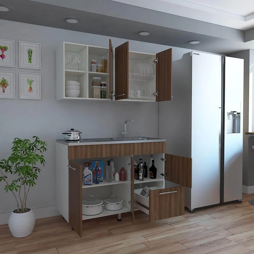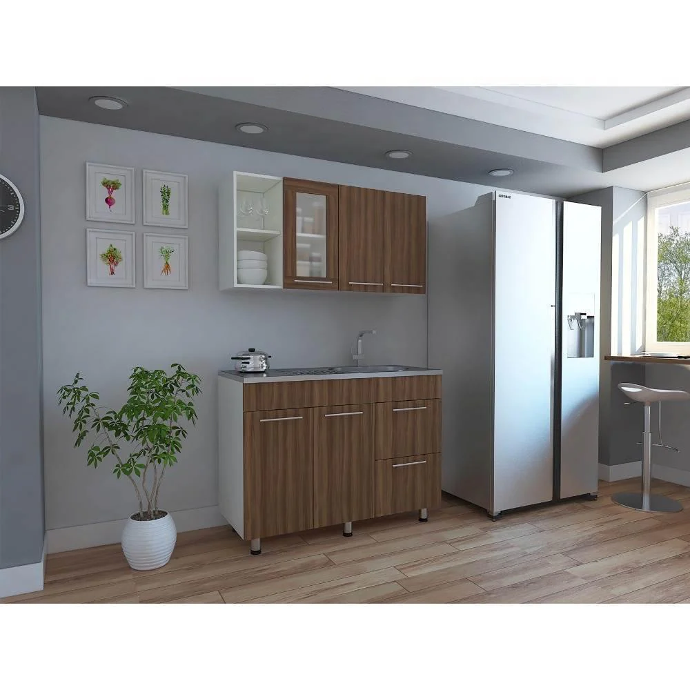 Disfruta de esta cocina Thyra que aportará modernidad y dinamismo a tu hogar gracias a sus colores blanco y sangría. El mueble superior cuenta con locero y portavasos color blanco. Manijas metálicas y puerta de vidrio con listones. El mueble inferior tiene manijas metálicas, tres puertas abatibles y un cajón. Incluye mesón liso con pozuelo derecho en acero al igual que sus patas.
